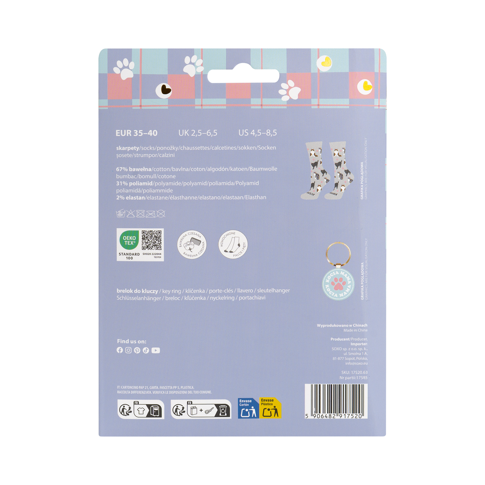 Zestaw prezentowy dla dumnej kociej mamy! Skarpetki z uroczym motywem kotów i dopasowany brelok „Kocia mama” dodadzą humoru i charakteru codziennym dniom. Idealny prezent dla kobiety, której serce bije w rytmie mruczenia!