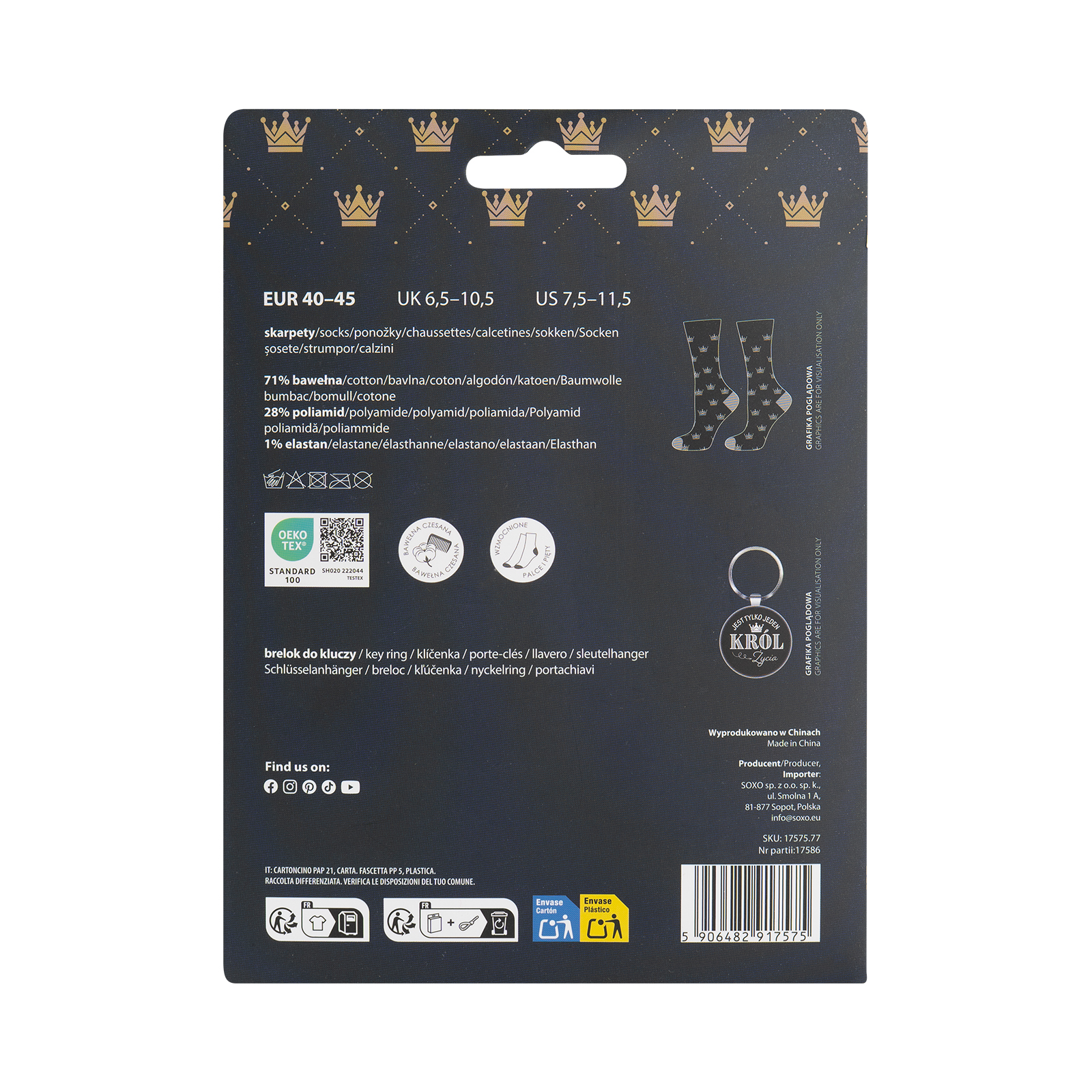 Zestaw „Jest tylko jeden król życia” to prezent dla faceta, który wie, kto rządzi. W komplecie eleganckie skarpetki w rozmiarze 40–45 oraz brelok z królewskim hasłem.