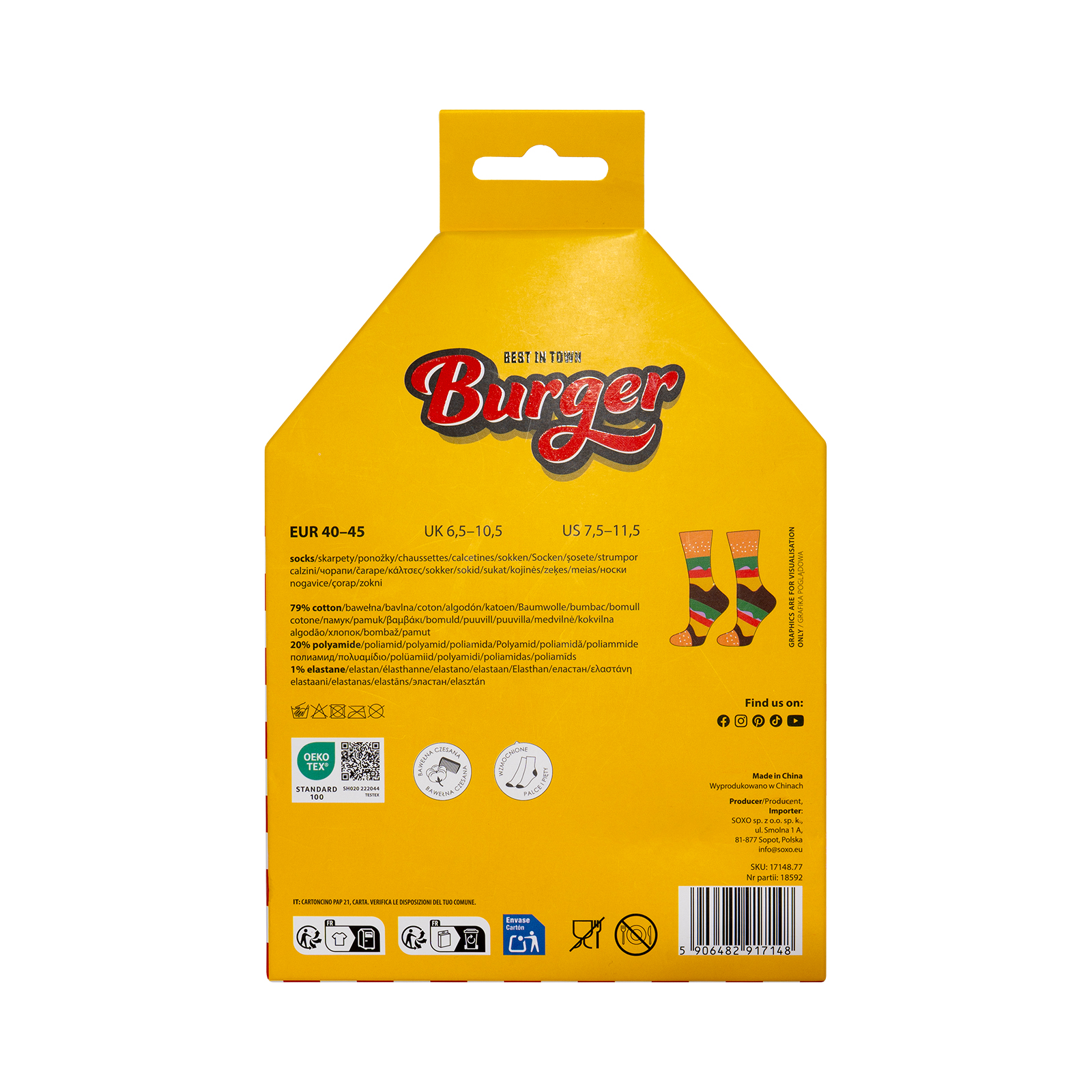 Męskie skarpety z motywem burgera, zapakowane w opakowanie przypominające klasyczny fast food, to zabawny i smakowity pomysł na prezent dla każdego fana jedzenia i oryginalnych gadżetów.