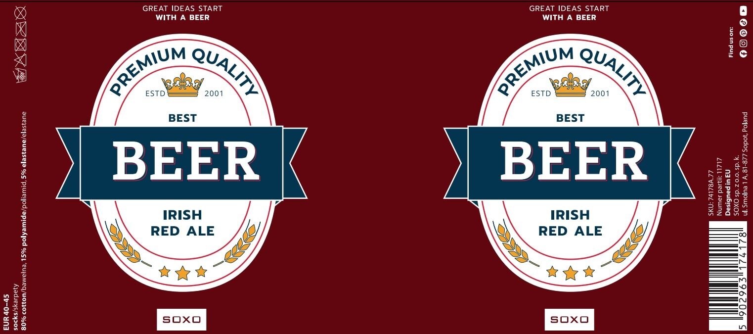 Men's colorful SOXO GOOD STUFF socks, funny Irish Red Ale Beer in a tin for a gift with inscriptions