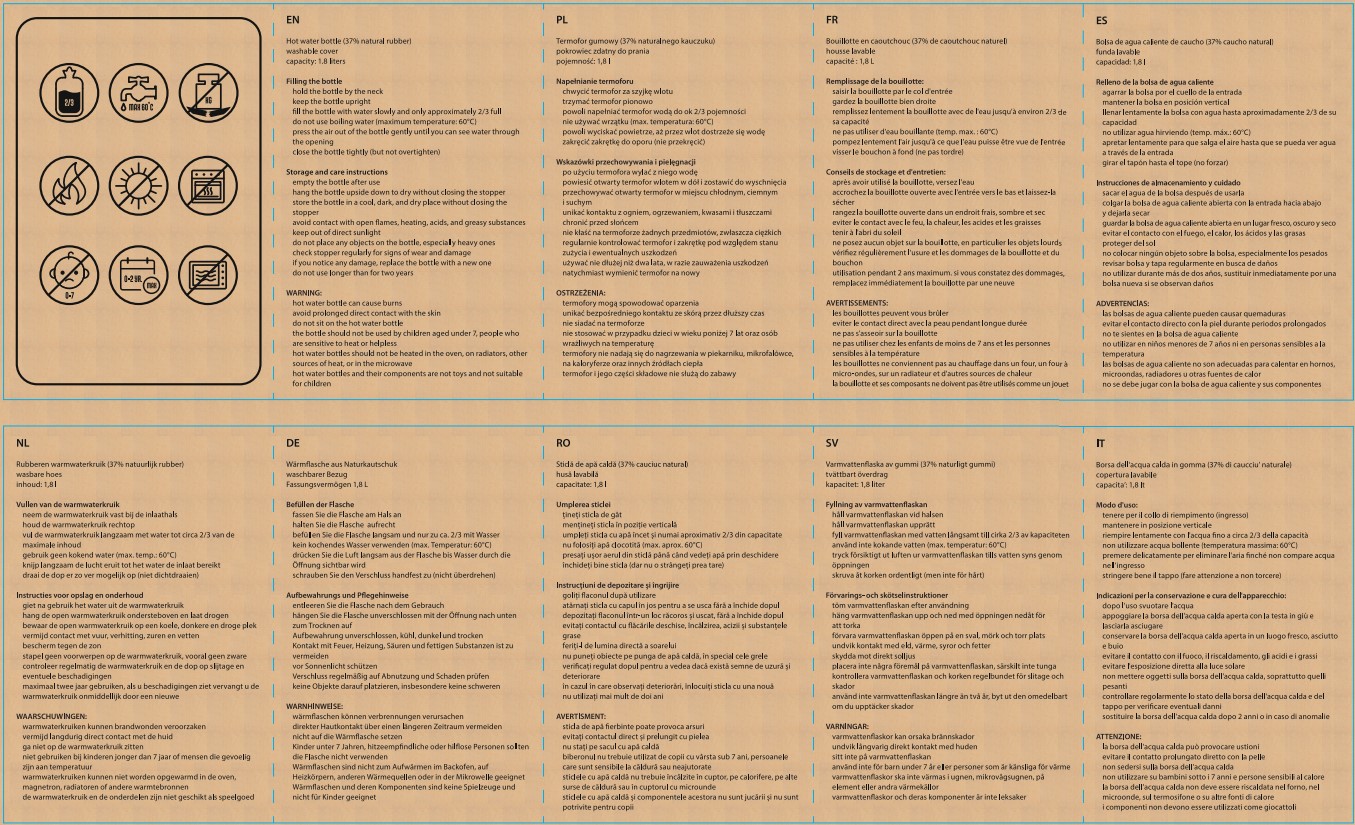 slowly fill the hot water bottle with water to about 2/3 of its capacity, do not use boiling water (max. temp. 60°C)